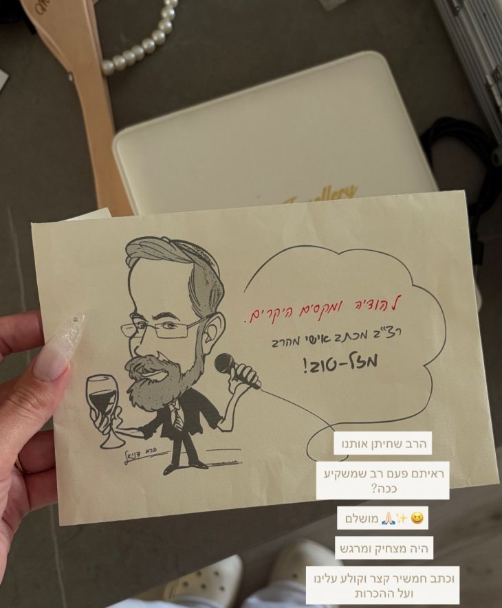 ובחופה עצמה קרה משהו מיוחד. הרב דניאל כתב קטע אישי, מרגש ומצחיק, שסיפר את הסיפור שלנו בצורה כל כך חכמה ורגישה שהאורחים פשוט הקשיבו. באמת הקשיבו. ראינו אנשים מרימים את המבט, עוזבים את הפלאפונים, מחייכים, מתרגשים ומתחברים לרגע ביחד איתנו. מחיר: 1,500 הערות לגבי המחיר: האמת שהוא גבה פחות אבל היינו חייבים לפרגן לו!