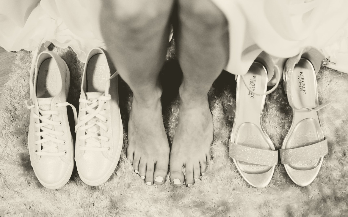 גם אם את לא מאסטר בהליכה על עקבים, את לא צריכה לוותר על נעלי עקב. בחרי בנעליים בעלות עקב בינוני, רחב ויציב שיתן לך תמיכה מלאה. אם את מעדיפה ללכת על שטוח מטעמים אלו ואחרים (נוחות זה לא הכל, גם גובה משחק פה תפקיד), יש לך לא מעט אפשרויות. בעיקר בעונות האביב והקיץ הרשתות מוצפות בנעליים וסנדלים שטוחים בצבעים בהירים או עזים שיכולים ללכת נהדר עם שמלת כלה.